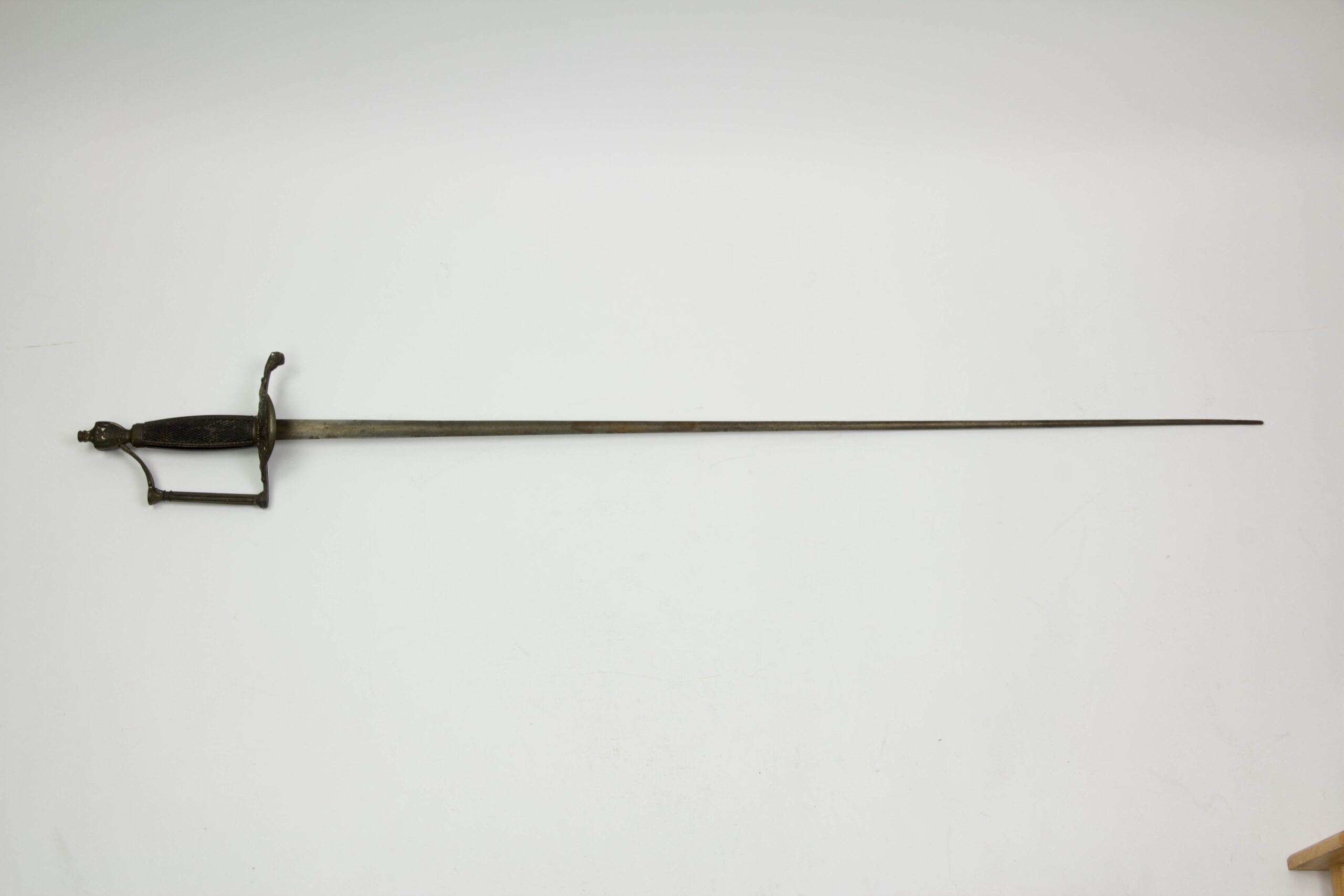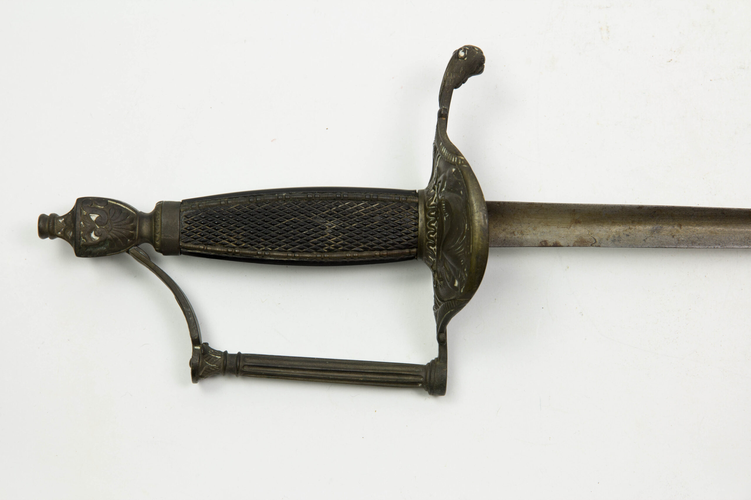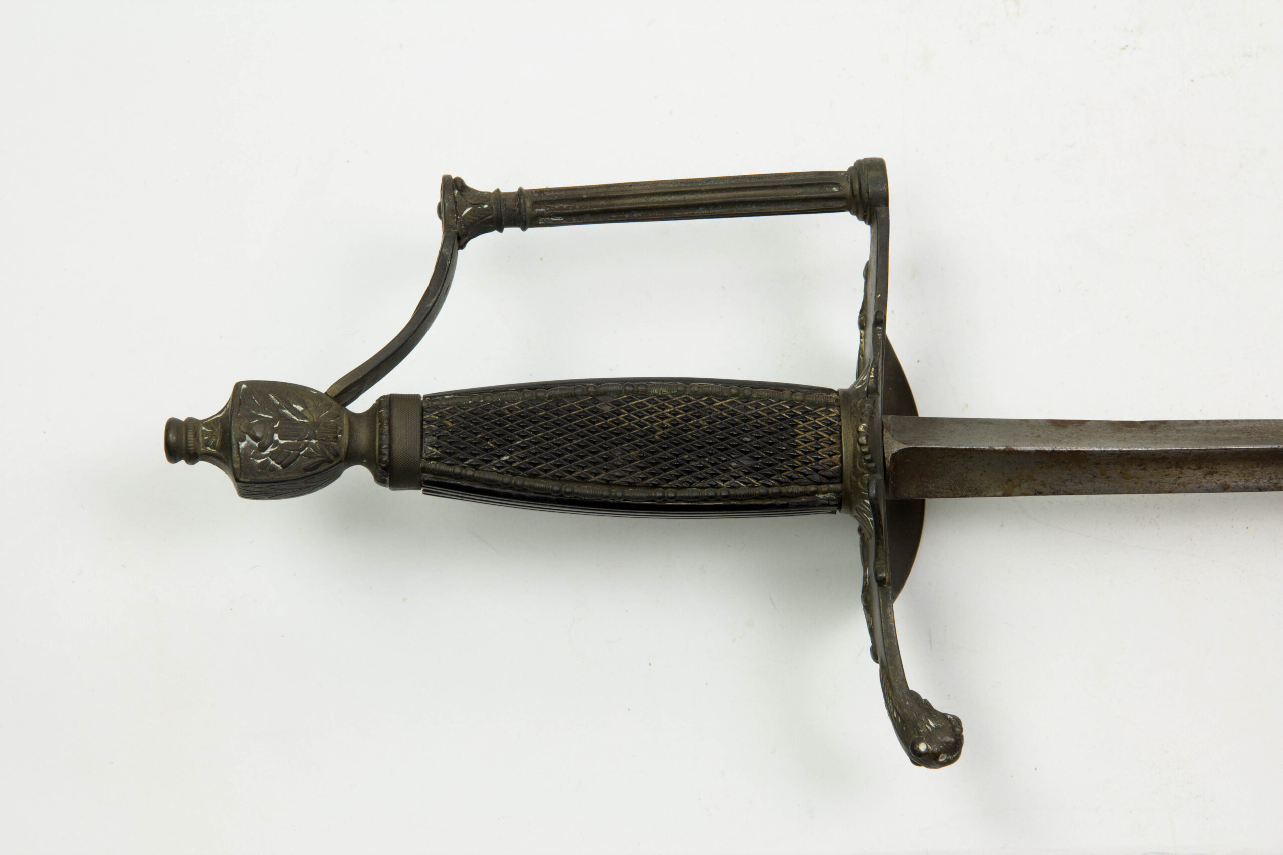 Frankreich, Consulat, Marine, vor 1804, Bronzegefäß, halbrundes Stichblatt mit auf Anker sitzender Aphrodite auf Nordstern zeigend, Griffbügel in Form einer griechischen Säule mit Kapitell in urnenförmigen, flachgedrückten Knauf endend, Knauf beidseitig graviert mit Ornamenten, Lektorenbündeln, Kriegstrophäen und Helm verziert, geriffeltes Ebenholz-Griffstück mit Perlstabkanten aus Bronze, spätere Dreikantklinge, Gefäßalter grüner Patina, Gebrauchsspuren, selten. L: 98 cm.