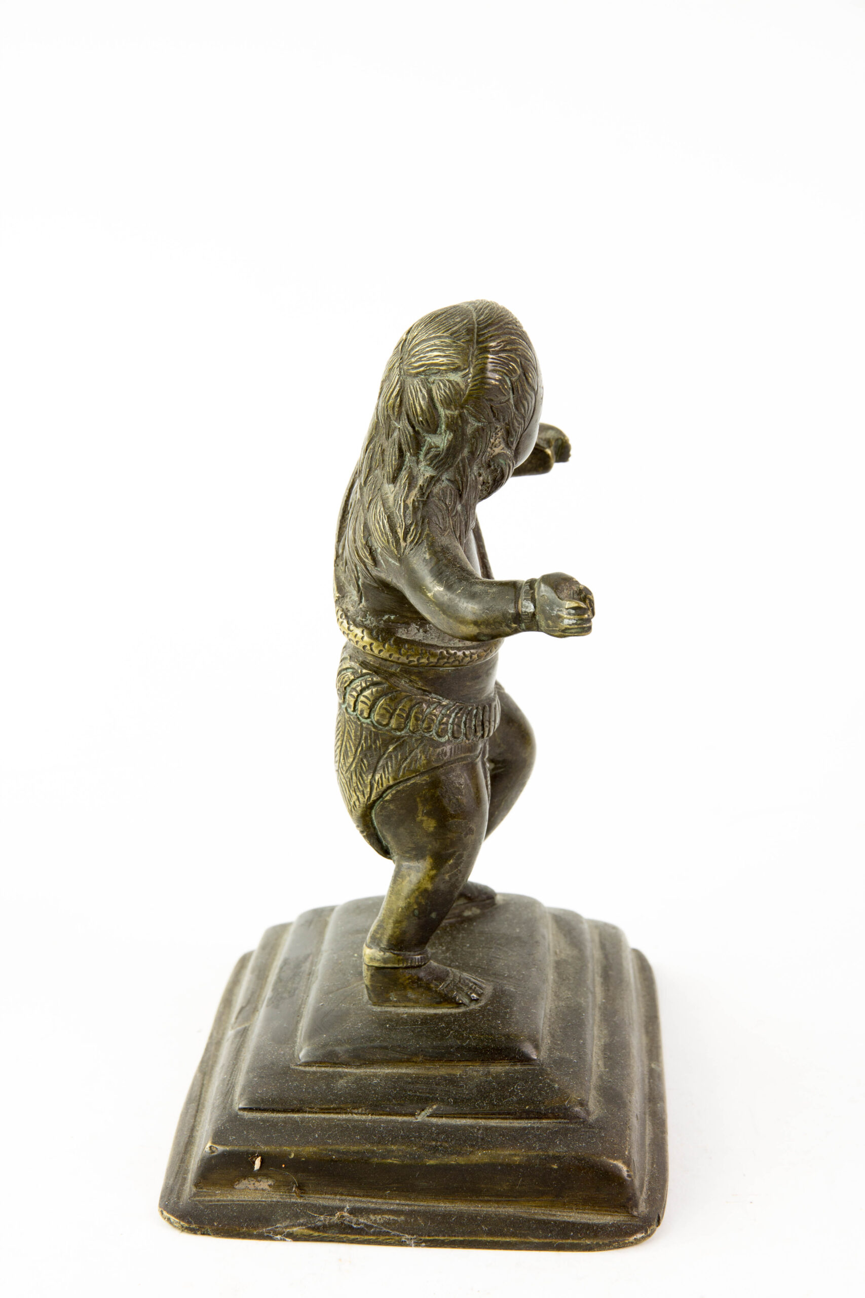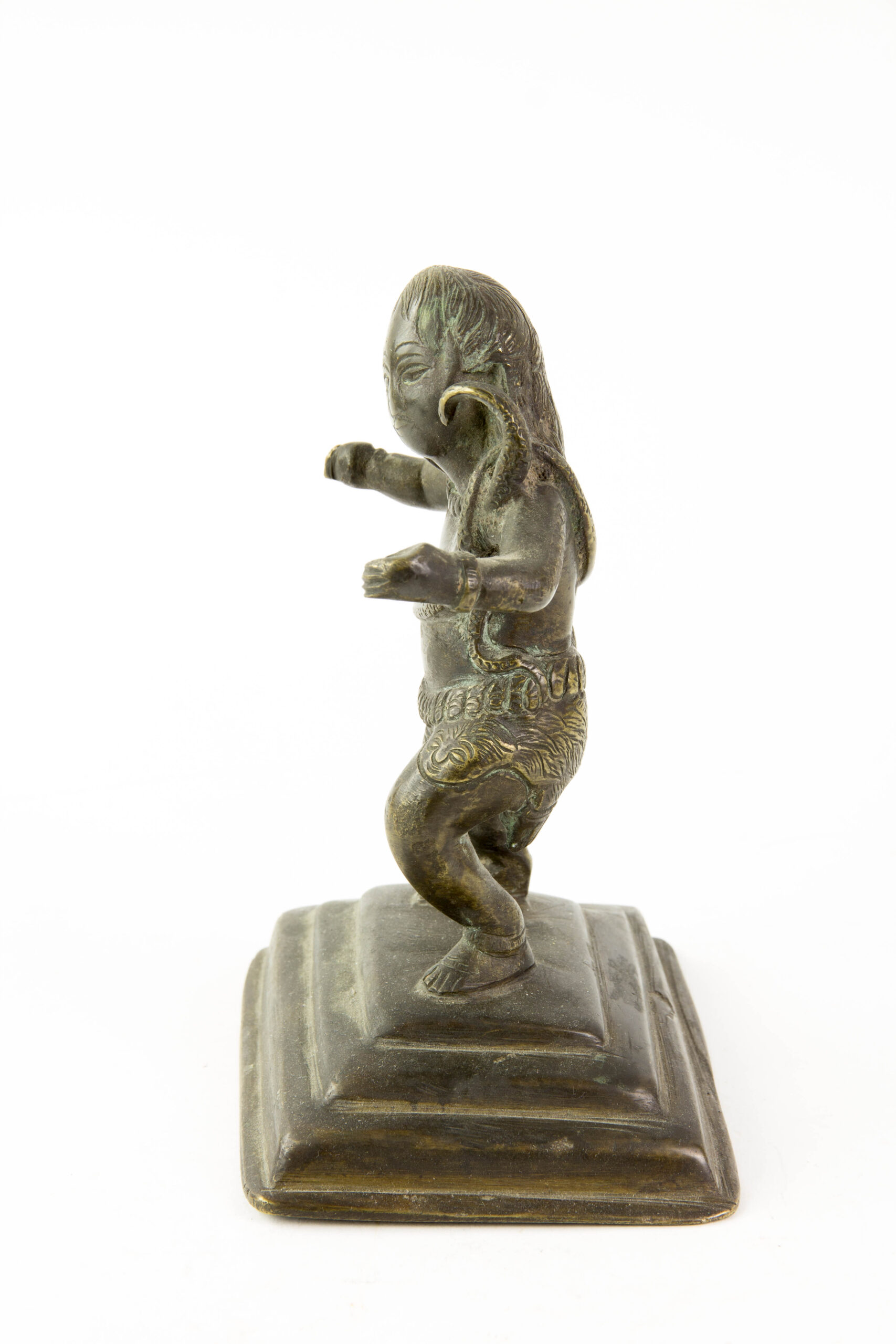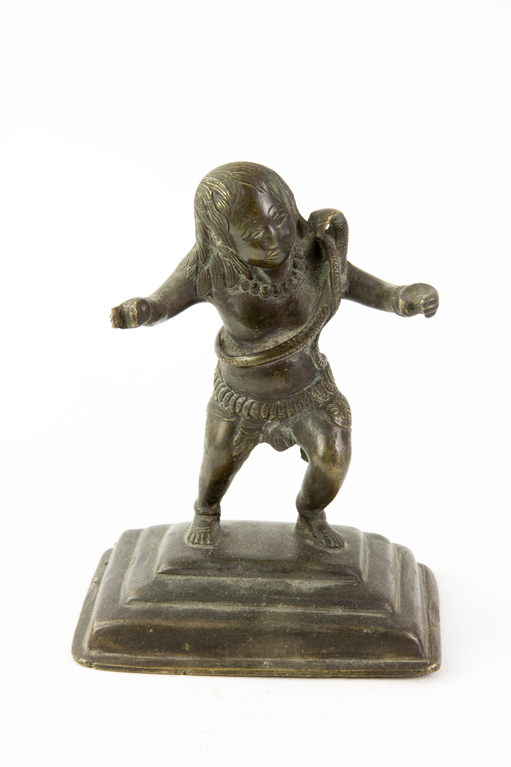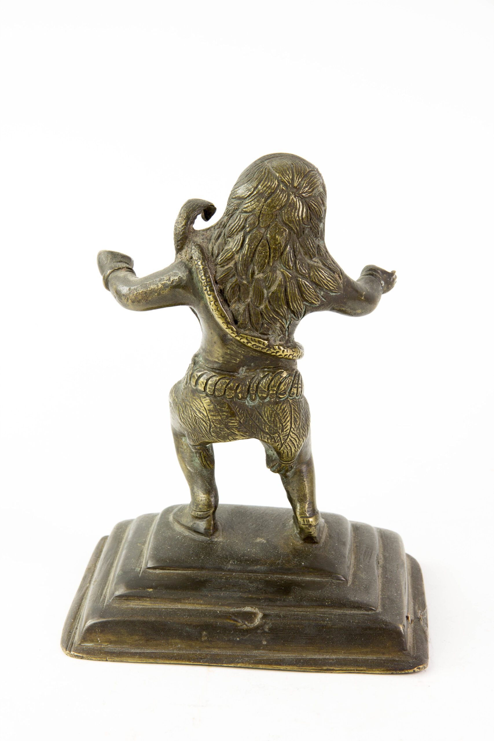 Indien, 18./19. Jh., Bronze, Figur Shiva mit der Kobra um den Hals, gestreckte Arme mit ursprünglich weiteren Attributen, die fehlen oder abgebrochen sind, Tigerfell mit Kopf als Lendenschutz, Gebrauchsspuren. H: 18 cm.