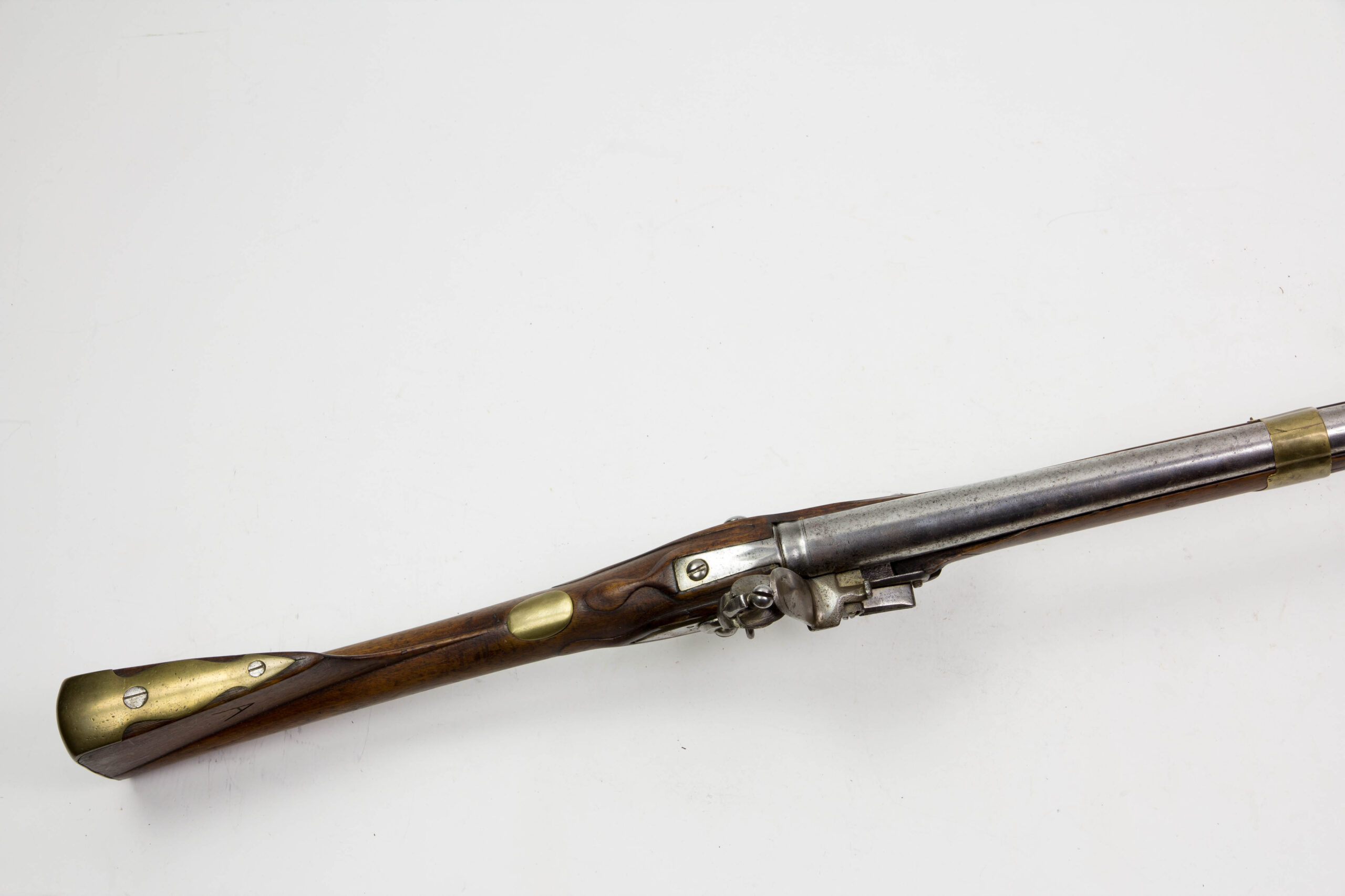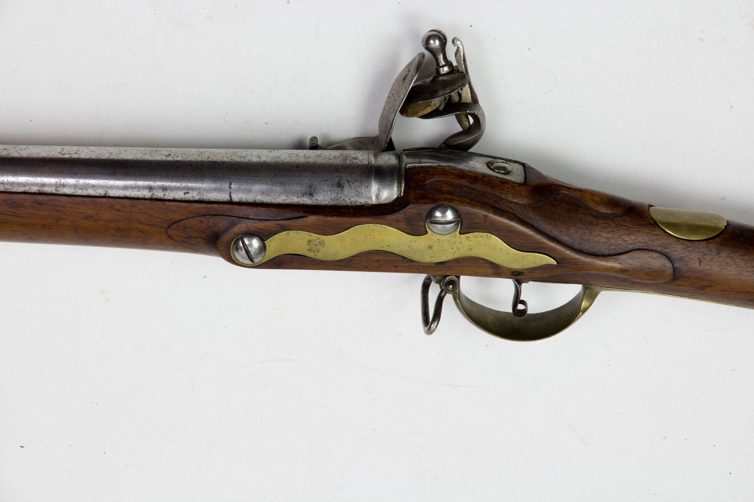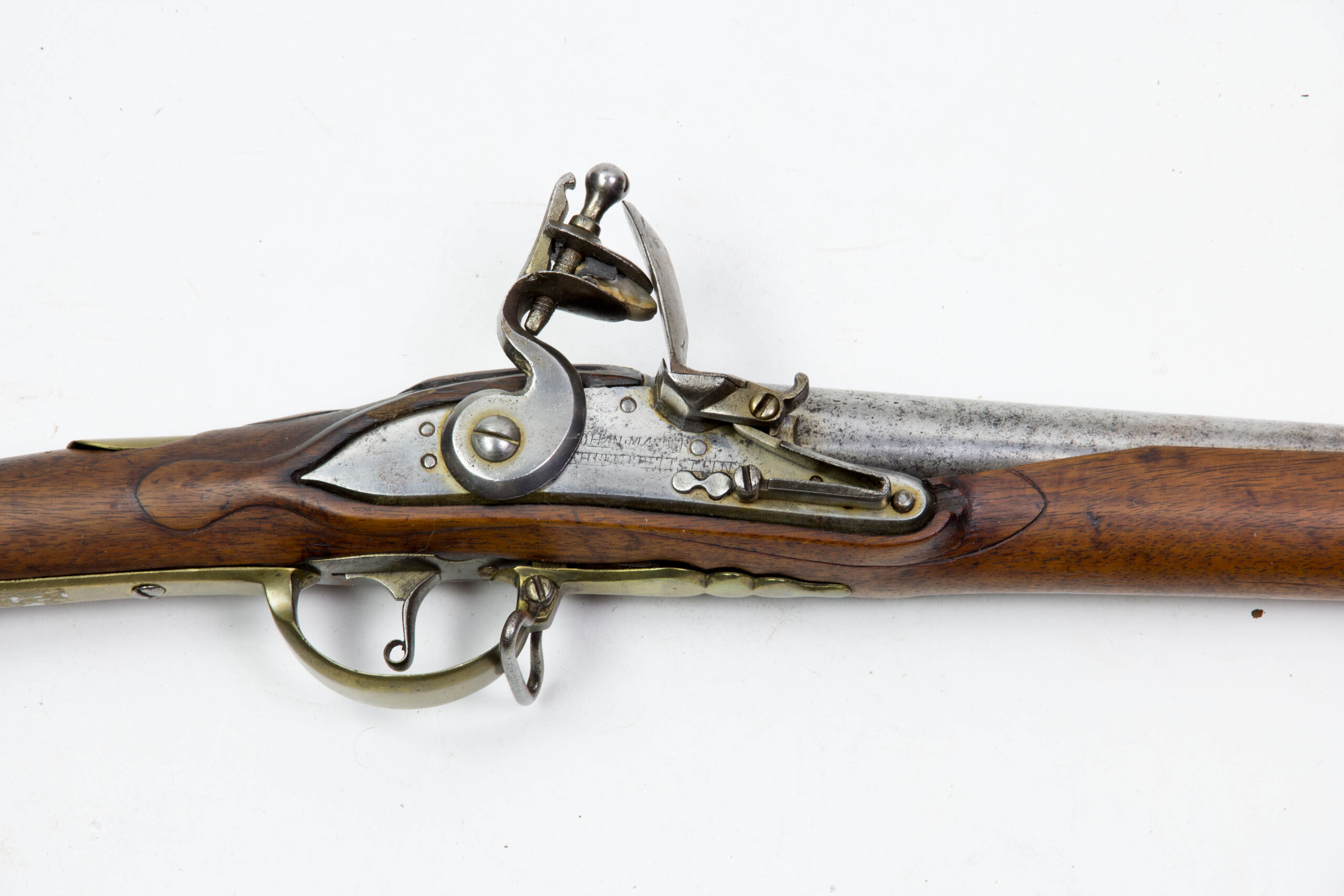 Hessen, um 1721, Kuhfußgewehr, Nussbaum geschäftet, Messinggarnituren, schlangenförmiges Gegenblech, glatte Daumenplatte aus Messing, Monogramm entfernt, Schlossplatte signiert: Johan Marter, Ehrenbreitstein (siehe Stöckel, es kommen mehrere Waffenhersteller in Frage), Gewehr wurde um 1800 mit Messingbeschlägen modernisiert, glatter Lauf ohne Korn, aber mit Bajonettwarze, Holzausbruch am Schloss, Schloss defekt, lässt sich nicht spannen, Gebrauchsspuren, für das Alter sehr guter Zustand. L: 144 cm.