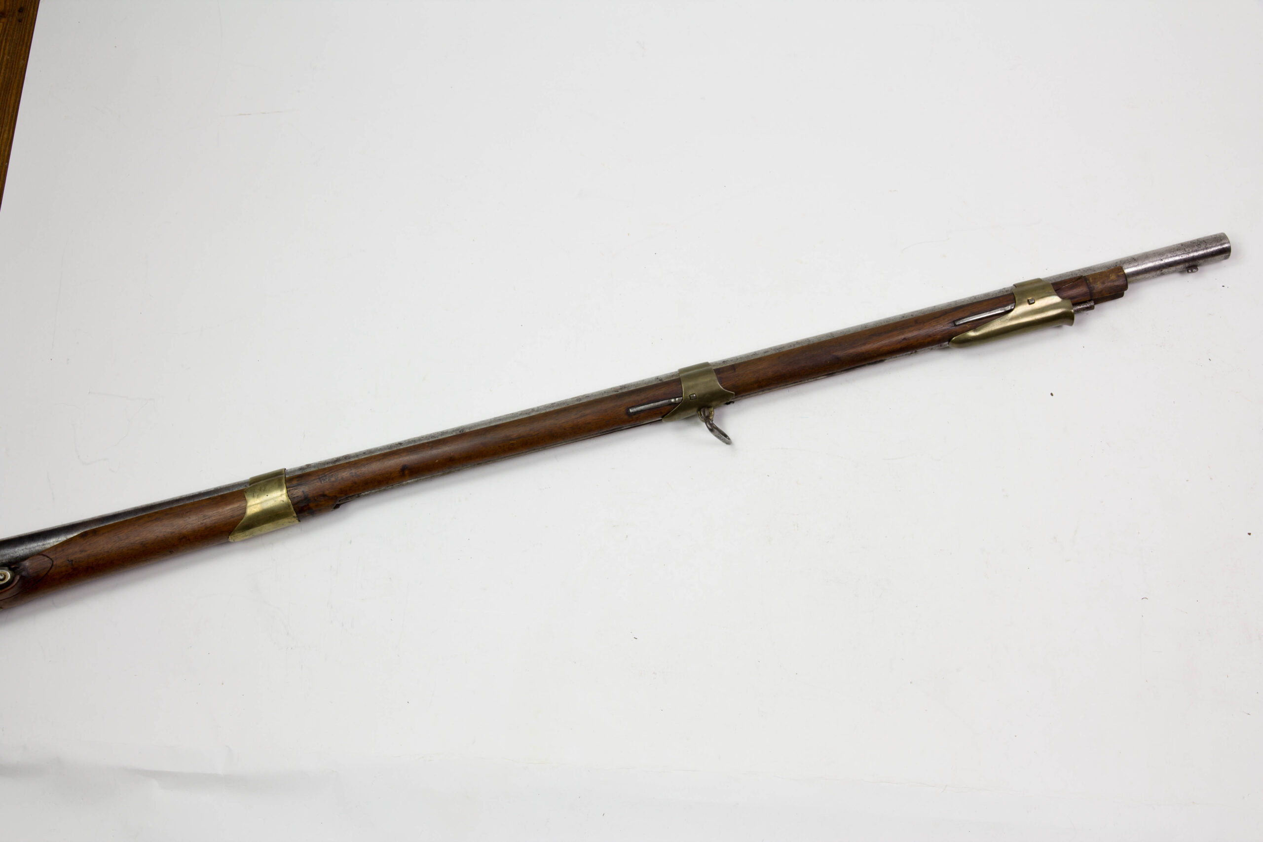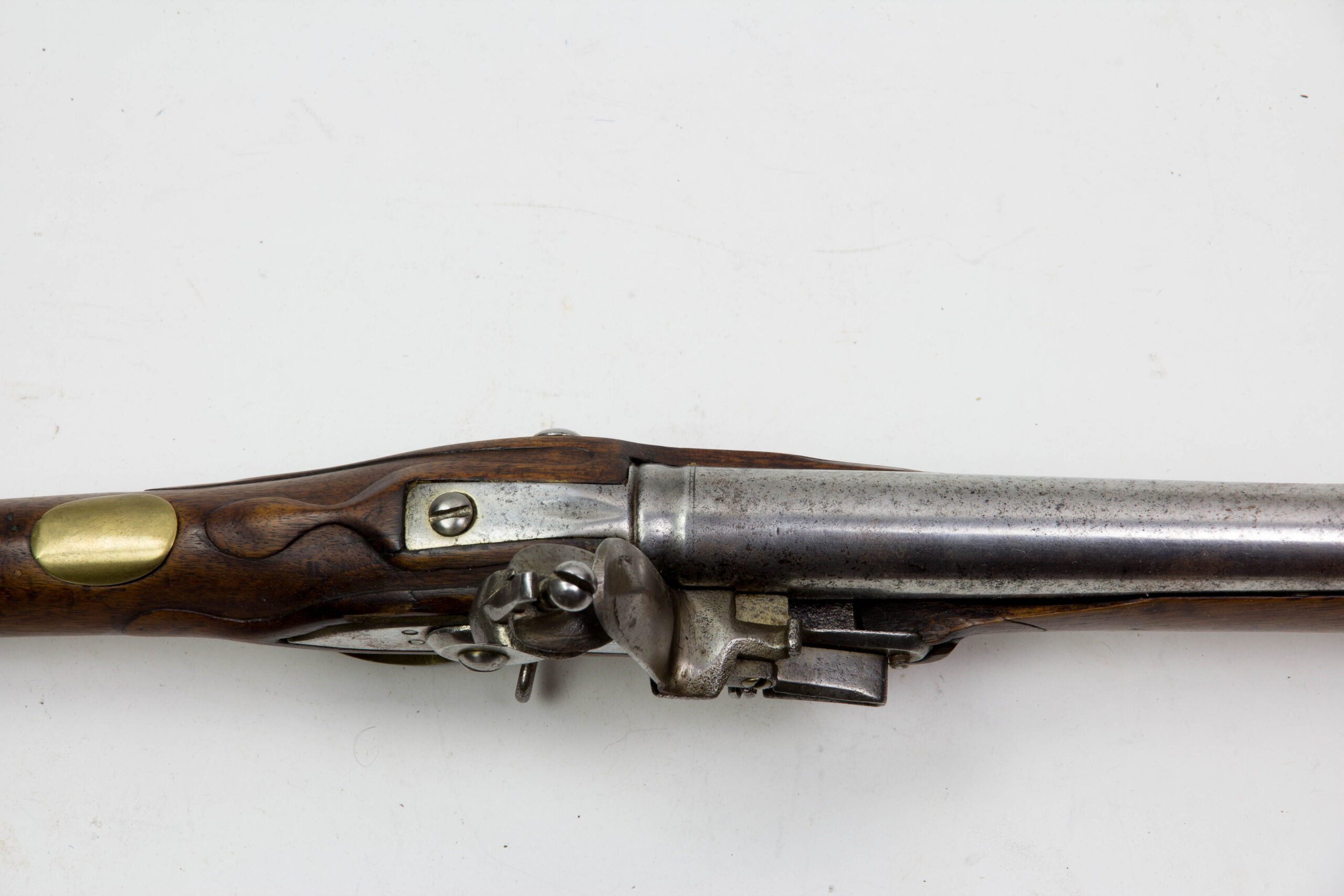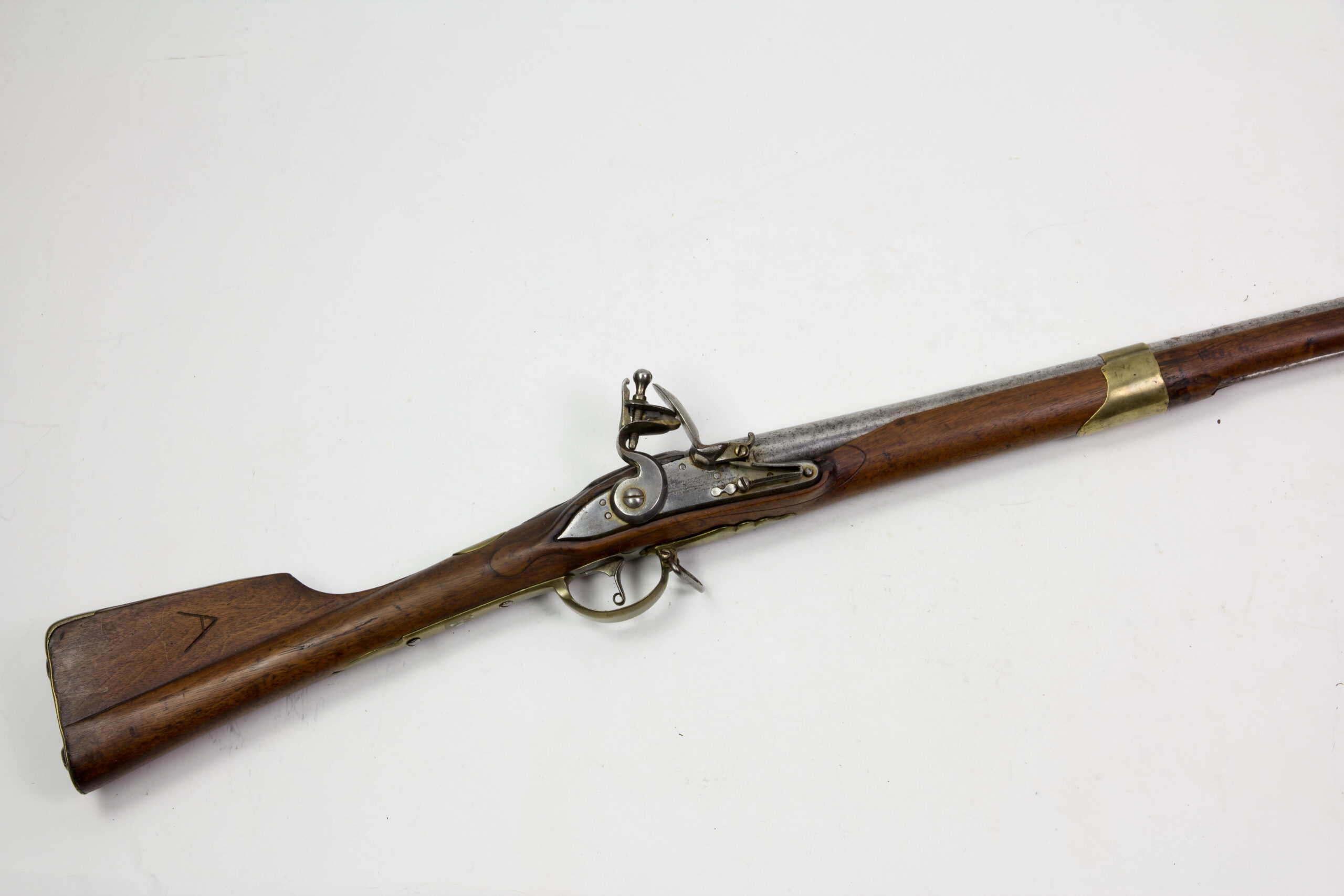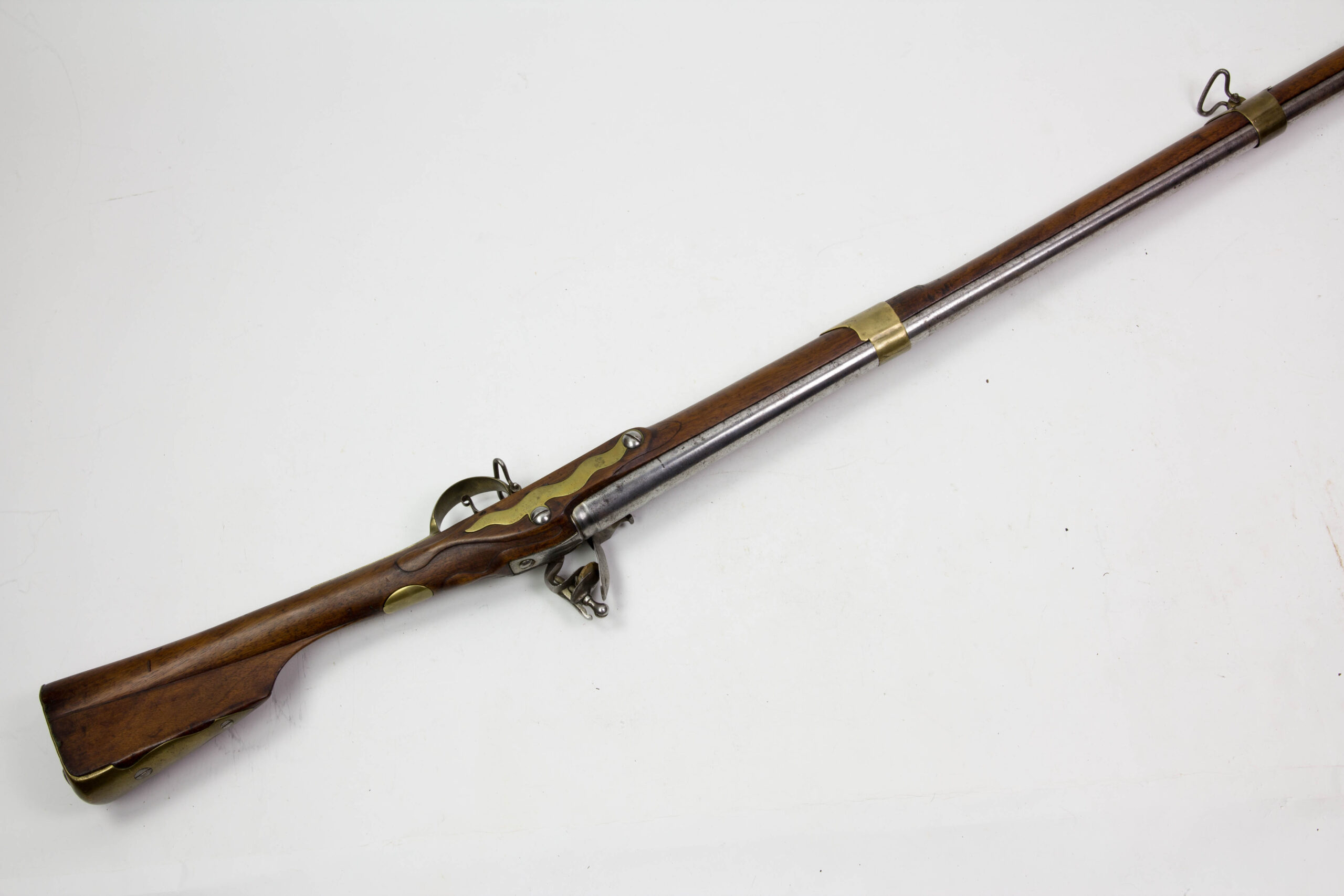 Hessen, um 1721, Kuhfußgewehr, Nussbaum geschäftet, Messinggarnituren, schlangenförmiges Gegenblech, glatte Daumenplatte aus Messing, Monogramm entfernt, Schlossplatte signiert: Johan Marter, Ehrenbreitstein (siehe Stöckel, es kommen mehrere Waffenhersteller in Frage), Gewehr wurde um 1800 mit Messingbeschlägen modernisiert, glatter Lauf ohne Korn, aber mit Bajonettwarze, Holzausbruch am Schloss, Schloss defekt, lässt sich nicht spannen, Gebrauchsspuren, für das Alter sehr guter Zustand. L: 144 cm.